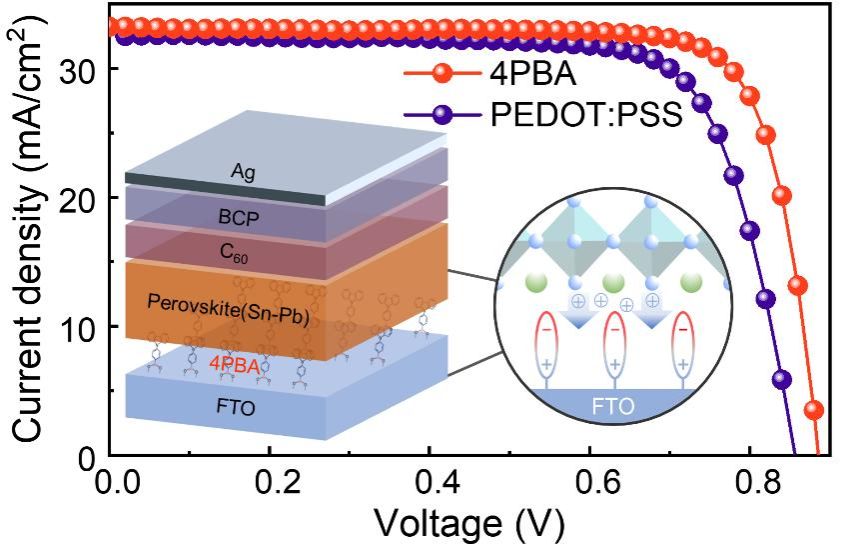 混合锡铅钙钛矿得益于其窄带隙的特性,在高效单结太阳能电池以及全钙钛矿叠层太阳能电池的制造上均具有巨大潜力。然而锡铅钙钛矿器件普遍使用的空穴传输材料会导致器件界面能带失配或引起锡铅钙钛矿埋底界面处的降解,限制了锡铅钙钛矿器件的效率与稳定性发展。因此,设计可靠的空穴选择材料对保证器件在界面处的电荷高效提取和长期稳定性十分重要。
