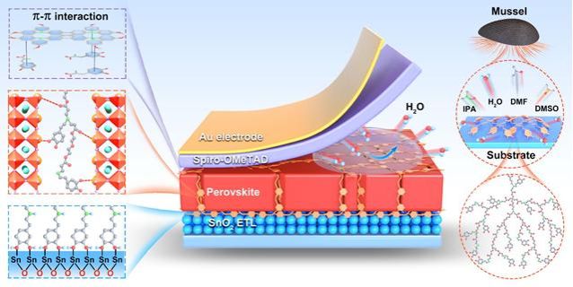 图1. 超支化多巴胺聚合物在钙钛矿中构建三维支架结构实现湿度粘附的示意图。