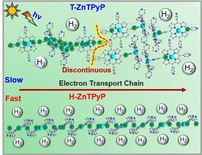 白锋教授团队在不同组装温度下合成了5,10,15,20-四(4-吡啶基)锌卟啉四棱纳米棒(T-ZnTPyPs)和六棱纳米线(H-ZnTPyPs)两种堆积结构的组装体。相比于T-ZnTPyP,H-ZnTPyPs表现出显著增强的可见光催化产氢活性。通过对有关光催化活性相关参数和理论计算的比较分析表明,高的光催化活性主要归因于H-ZnTPyP中长程π-π堆叠形成的的连续且通畅的电荷载体传输通道提高了其光生电子的传输效率。这项研究为合理设计具有可控π-π堆叠和高光催化性能的超分子光催化剂提供了一个理想的科学平台。