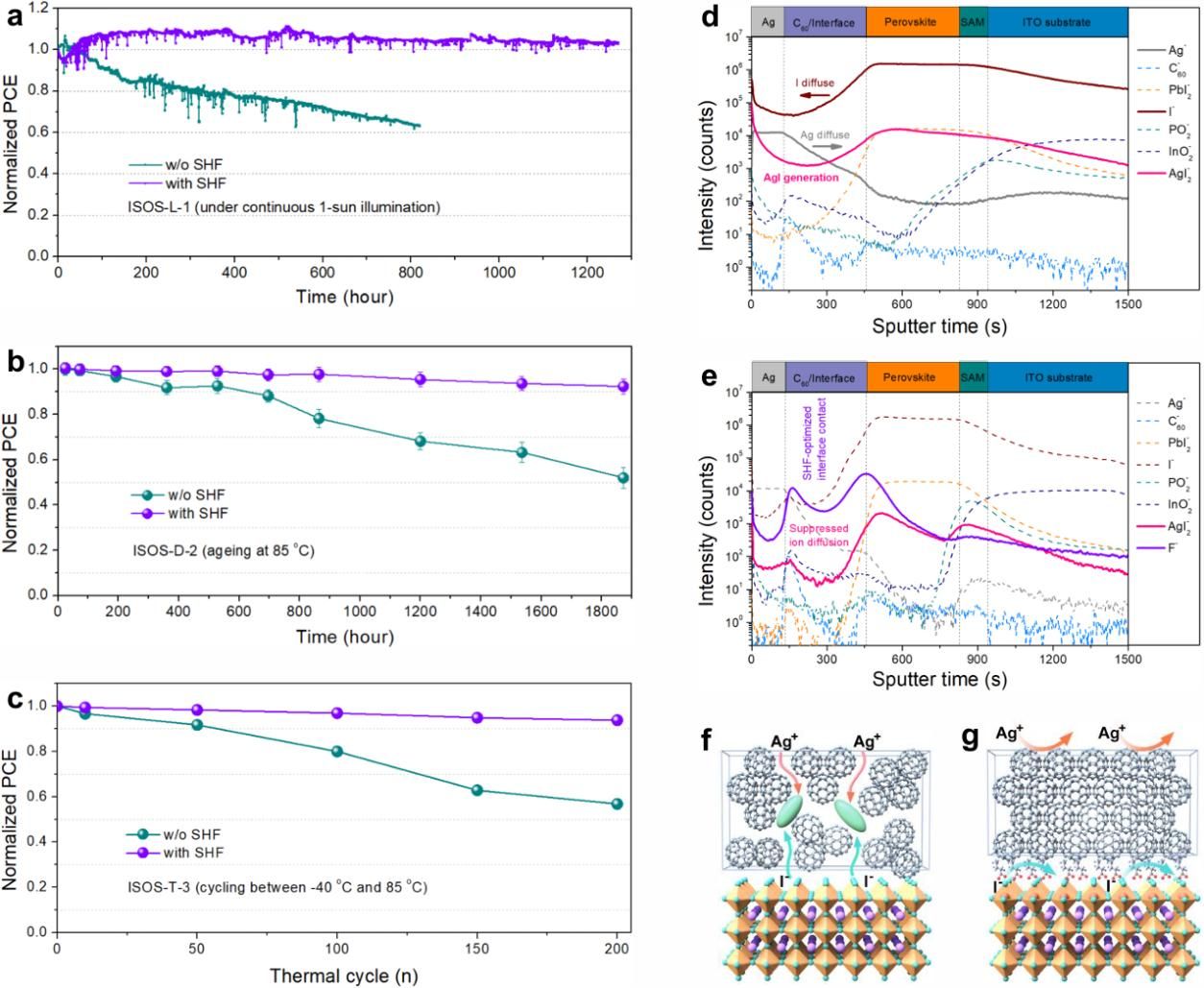图4:(a)在空气中模拟1个标准太阳光照(ISOS-L-1I)下,封装的对照器件和经SHF处理的器件的最大功率点(MPP)跟踪(初始PCE分别为23.7%和25.2%);(b)在85°C下老化的对照器件和经SHF处理的器件的热稳定性(ISOS-D-2I)。初始平均PCE分别为24.1%和25.9%(每种条件下n=3个独立器件,误差棒代表标准偏差);(c)在-40°C至85°C之间老化的封装器件的热循环稳定性(ISOS-T-3)(初始PCE分别为24.5%和26.4%);热老化后(d)对照器件和(e)经SHF处理的器件的飞行时间二次离子质谱(ToF-SIMS)离子种类深度分布,涉及Ag-(Ag)、C60-(C60)、PbI2-(钙钛矿)、I-(钙钛矿)、PO2-(自组装单分子层,SAM)、InO2-(氧化铟锡,ITO)、AgI2-(AgI)和F-(SHF);(f)对照器件和(g)经SHF处理的器件内的离子扩散示意图。