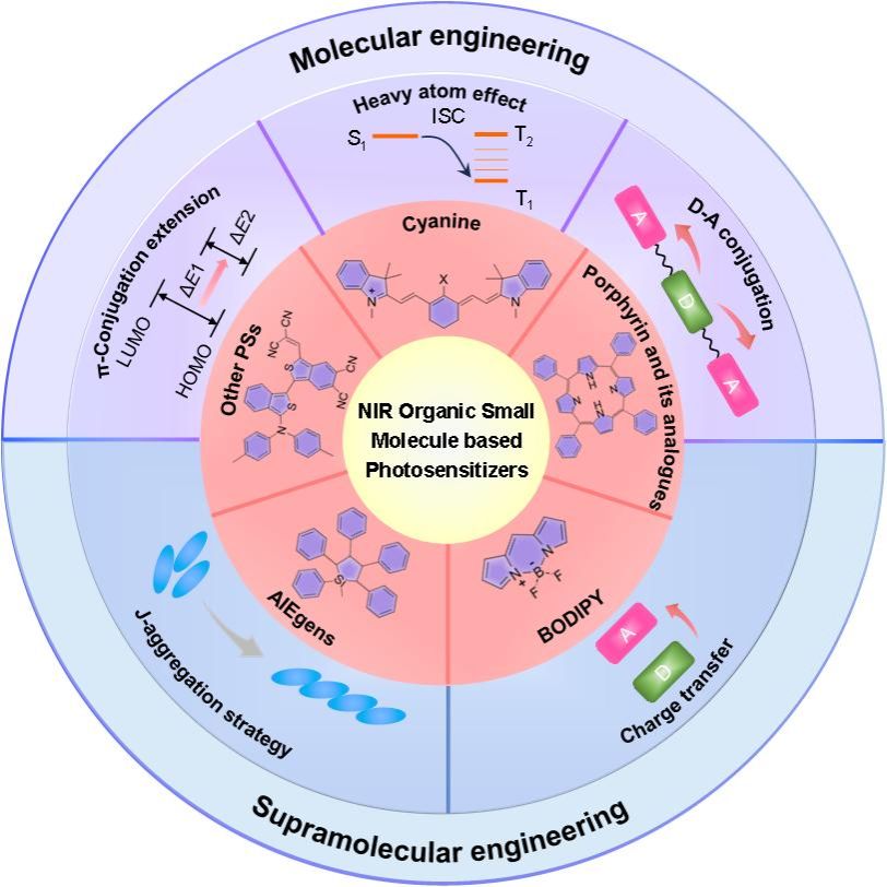 近红外(NIR)光动力疗法(PDT)因具备组织穿透能力强、选择性高、侵入性小以及不易产生耐药性等优势,已成为一种极具临床应用前景的肿瘤治疗方法。然而,开发高性能近红外光敏剂(PSs)仍面临诸多挑战,例如,其近红外吸收能力有限以及活性氧(ROS)生成效率较低等问题。该综述系统阐述了两类关键构建策略:分子工程(例如扩展π共轭、重原子效应、D-A共轭)和超分子工程(例如J聚集、电荷转移组装),旨在实现吸收光谱红移并提高系间窜越(ISC)效率。文中重点分析了花青、卟啉、BODIPY、聚集诱导发光体(AIEgens)等有机染料的合理设计及其活性氧生成性能,深入探讨了分子结构和聚集行为对PDT疗效的影响。此外,文章介绍了具备多种功能的先进近红外光激活PDT纳米平台,涵盖I型/II型PDT、双光子激发PDT以及PDT/光热(PTT)联合治疗等方向,并对当前面临的挑战和未来的发展方向进行了展望,为推进该类技术的临床转化提供了重要参考。