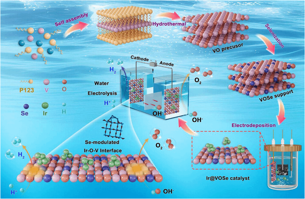 2025年8月4日,梅俊教授课题组在国际知名期刊《Advanced Functional Materials》上,发表题为“Selenium-Modulated Ir–O–V Interface for Adaptive Surface Reconstruction Toward Favorable Water Electrolysis”的研究性论文。