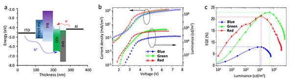图2 红绿蓝三色QLED器件性能 a 器件结构示意图;b 电流密度和亮度随电压变化关系;c 外量子效率(EQE)随亮度变化关系