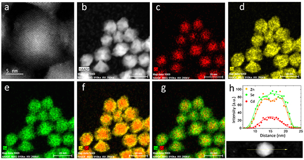 图1 CdSe/ZnSe 核壳结构量子点球差电镜形貌和组份表征 a 球差电镜图;b STEM图;c-g 元素分布图;h 元素空间分布比较