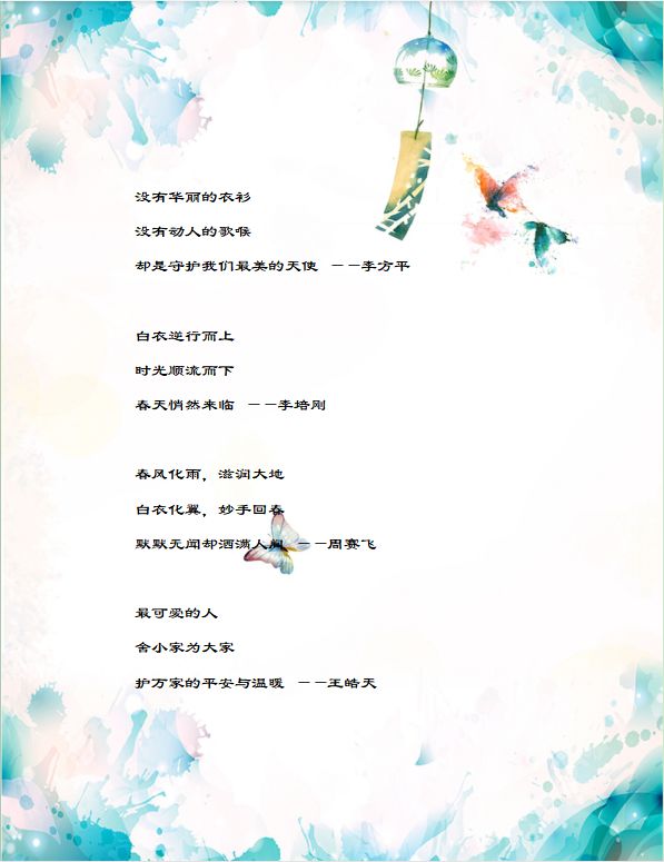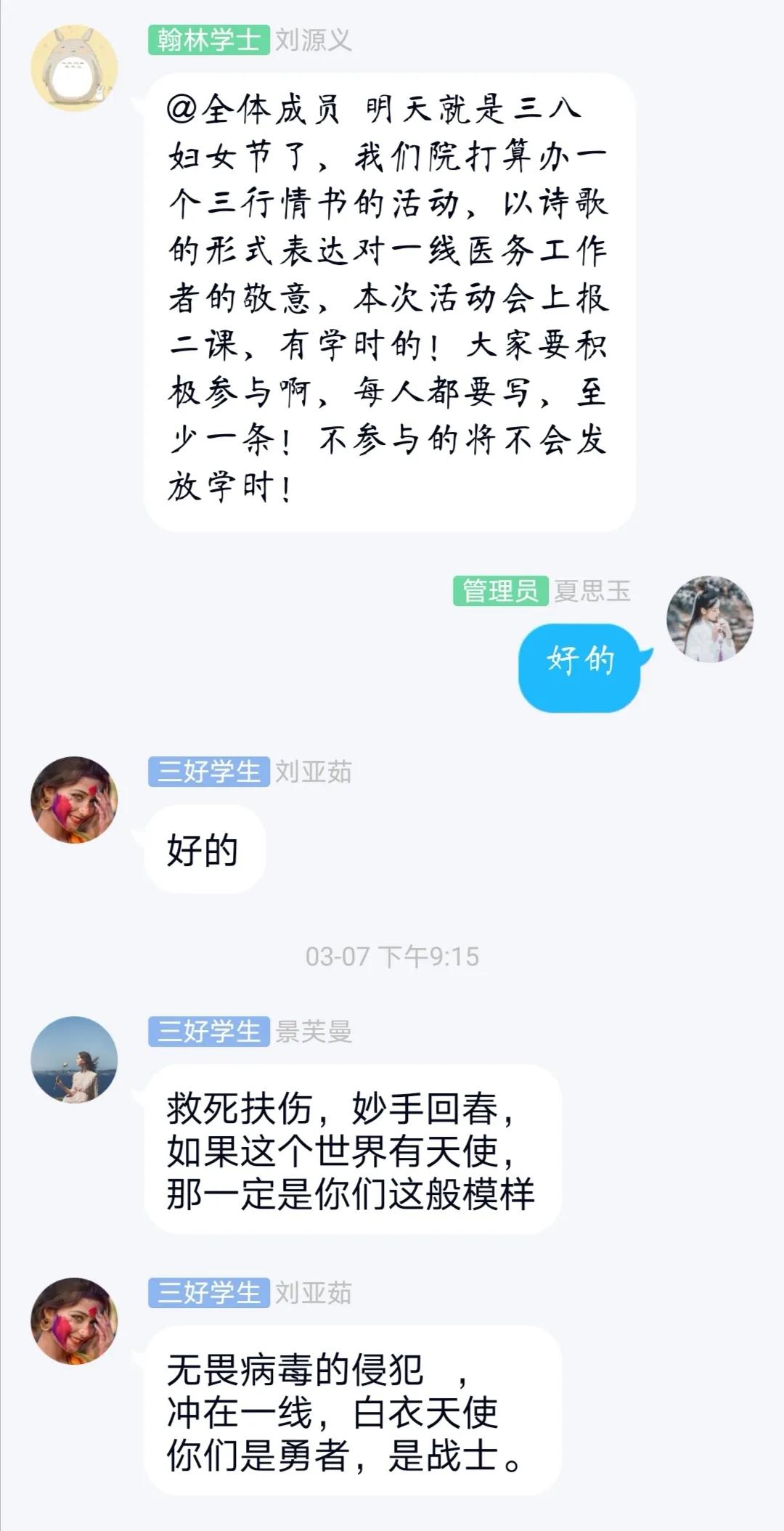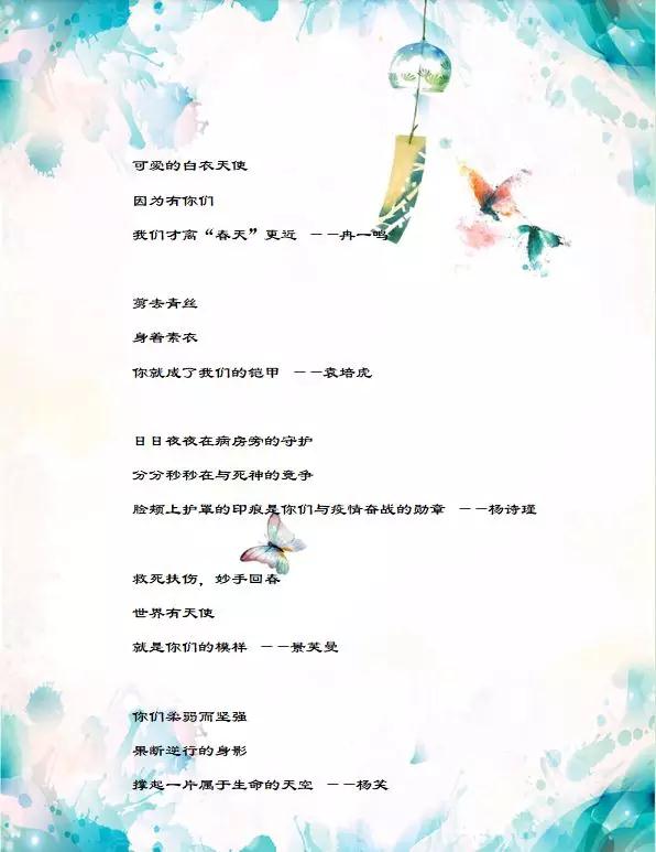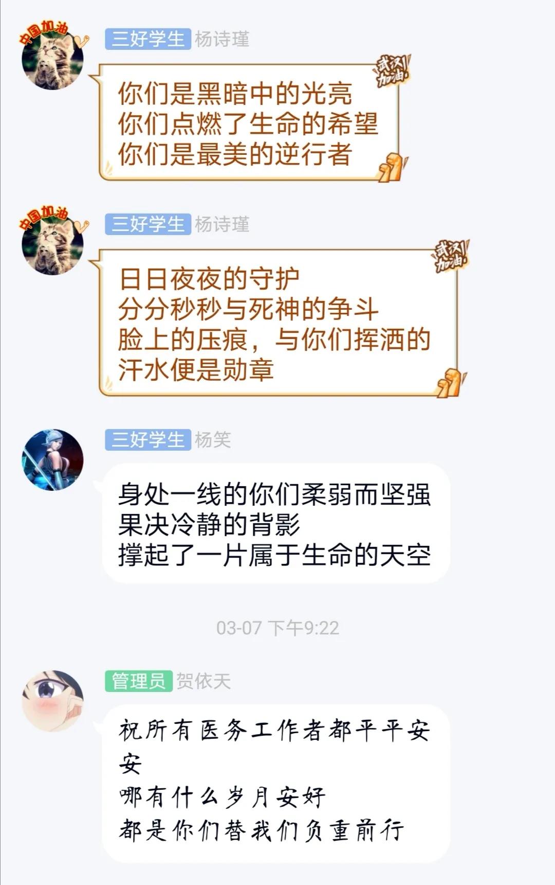 日前,习近平总书记强调,“当前,疫情防控正处于关键时期。”作为一名大学生团员,虽然在家学习,但心系疫情,时刻关注着“疫”情情况,也被无数英雄感动。因此,69成人小说 2019级本科生团支部特开展了一次以“三行情书——向抗‘疫’英雄致敬”为主题的团日活动。本次活动团员学生通过“三行情书”的形式向英雄们表达敬意,诉说真情。