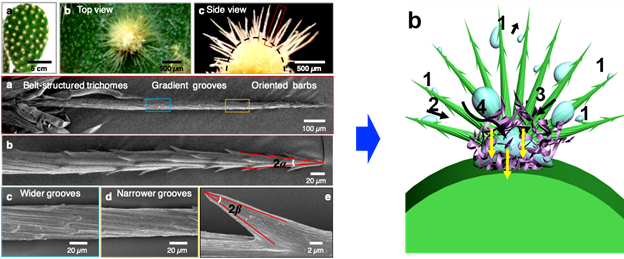 Multi-level structures of the multi-functional fog collection systems in cactus (O. Microdasys). 2012, Nat. Commun. 3, 12. Cactus spine inspired cone array fore oil/water separation. 2013, Nat. Commun., 4, 2276 (2)不对称浸润和粘附表面在生物医学中应用,如智能止血绷带,人工血管开发等。