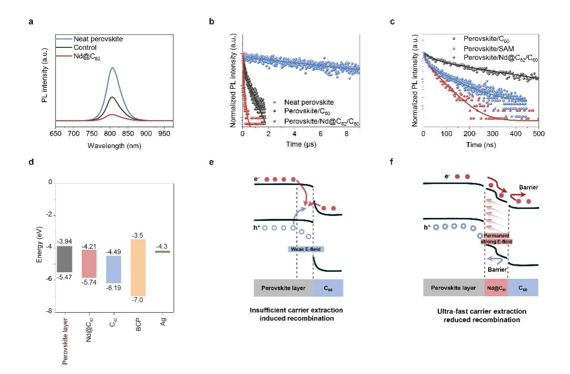 Nd@C82-PMMA耦合层用于平衡电荷载流子传输。(a)钙钛矿薄膜、对照组薄膜(钙钛矿/C60)和Nd@C82钙钛矿/Nd@C82/C60)薄膜的光致发光光谱图;(b)钙钛矿薄膜、对照组薄膜(钙钛矿/C60)和Nd@C82(钙钛矿/Nd@C82/C60)薄膜的时间分辨荧光光谱图;(c)钙钛矿/C60薄膜、钙钛矿/自组装单层(SAM)薄膜、钙钛矿/Nd@C82/C60薄膜的时间分辨荧光光谱图;(d)钙钛矿和电子传输层之间的能带排列;(e-f)能带排列示意图。