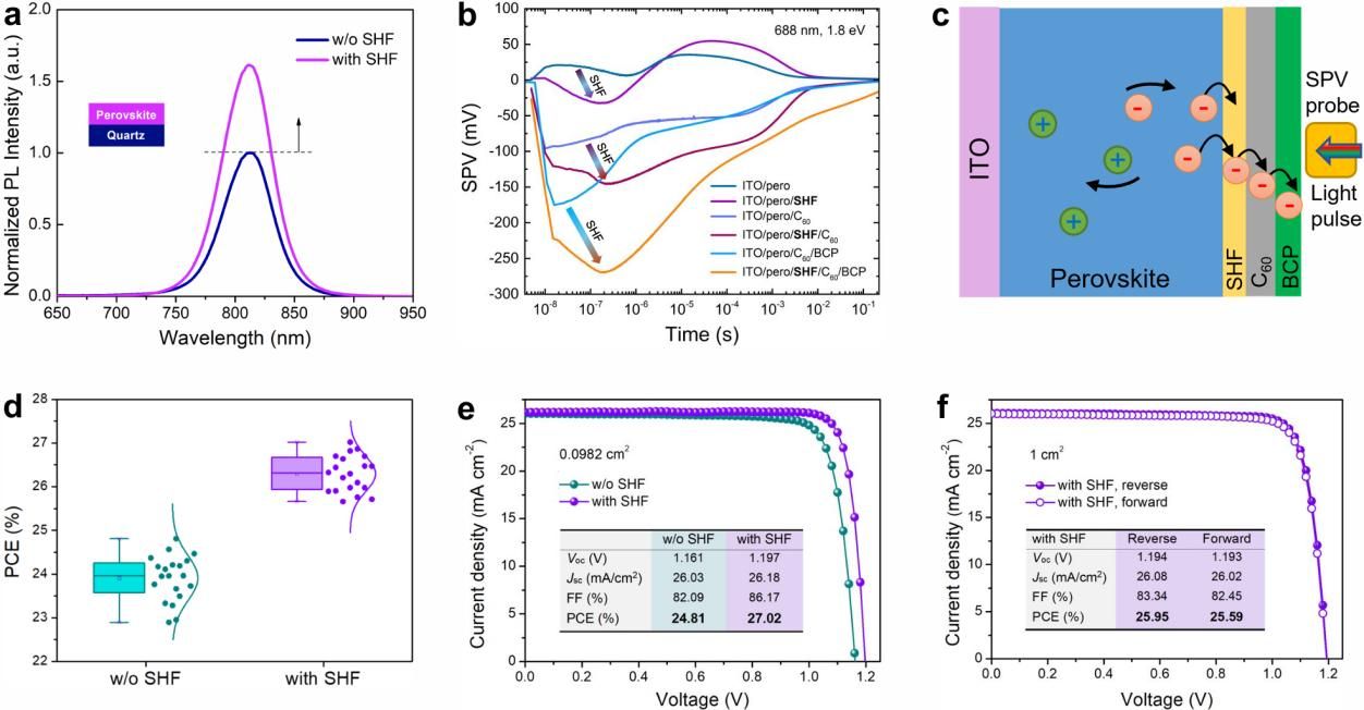 图3:(a)未经处理和经SHF处理的钙钛矿薄膜的稳态光致发光(PL)光谱,y轴显示归一化的PL强度;(b)钙钛矿/ETL界面处的瞬态表面光电压(tr-SPV)电荷动力学;(c)描述电荷分离机制的示意图;(d)对照和经SHF处理的PSCs的PCE分布,每种条件下从二十个独立器件收集(n=20),箱线图显示四分位距,中线为中位数,须线表示第5-95%;工作面积为(e)0.0982 cm2和(f)1 cm2的未经处理和经SHF处理的PSCs的电流-电压(J-V)曲线。