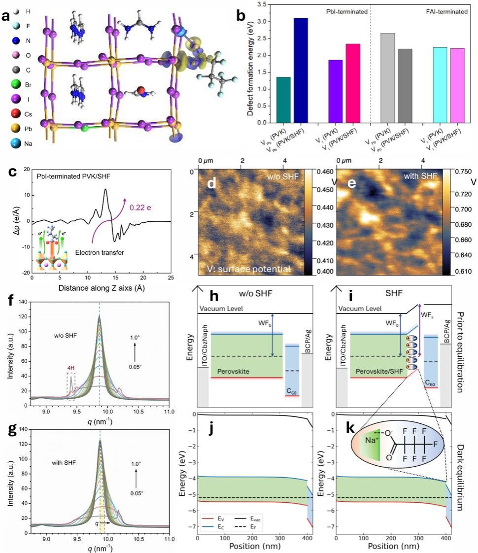 图1:(a)在钙钛矿结构上构建的SHF吸附模型;(b)有和没有SHF吸附时钙钛矿表面的缺陷形成能(PVK:钙钛矿);(c)单SHF吸附钙钛矿的PbI2端接表面的平面Δp;钙钛矿的KPFM图(d)无SHF和(e)有SHF,色标代表表面电势(V),比例尺:5μm;钙钛矿在(001)峰上的积分GIWAXS图案,(f)无SHF和(g)有SHF,入射角为0.05至1.0°;(h、j)对照器件和(i、k)含SHF器件在暗平衡前后的模拟能级图,SHF层引入了真空能级移动,并增强了跨 C₆₀的电场,这与内建电势的增加一致。